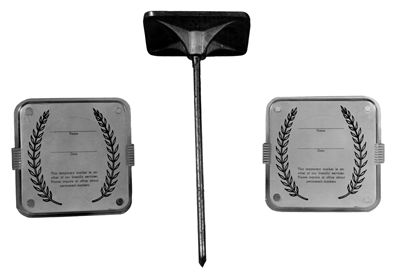 For use where upright markers are not permitted. Inscription enclosed in water-proof, transparent envelope and protected by heavy acrylic panes. When set, it rests one inch above ground.